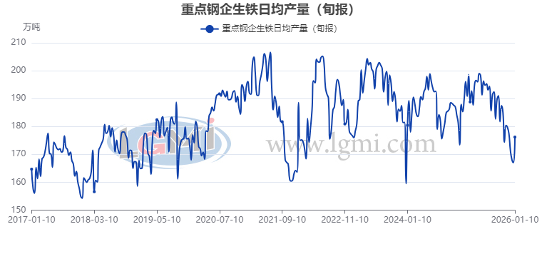 從重點(diǎn)大中型鋼鐵企業(yè)旬產(chǎn)數(shù)據(jù)來(lái)看,大中型鋼鐵生產(chǎn)企業(yè)的產(chǎn)能釋放力度明顯增強(qiáng)。據(jù)中國(guó)鋼鐵工業(yè)協(xié)會(huì)統(tǒng)計(jì)數(shù)據(jù)顯示,2026年1月上旬重點(diǎn)鋼企生鐵日均產(chǎn)量176.2萬(wàn)噸,旬環(huán)比上升5.5%,同比下降6.2%(詳見圖3);1月上旬重點(diǎn)鋼企粗鋼日均產(chǎn)量199.7萬(wàn)噸,旬環(huán)比上升21.6%,同比下降3.3%(詳見圖4);1月上旬重點(diǎn)鋼企鋼材日均產(chǎn)量182.2萬(wàn)噸,旬環(huán)比下降3.7%,同比下降4.0%(詳見圖5)。