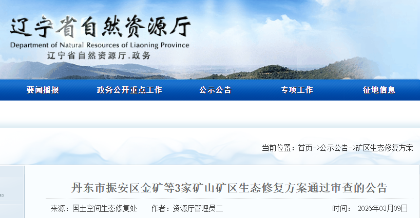 根據(jù)《土地復墾條例》和《遼寧省地質(zhì)環(huán)境保護條例》有關要求,丹東市振安區(qū)金礦、寬甸智國新軍礦業(yè)有限公司小湯石硼礦、海城鎂礦集團有限公司海城鎂礦礦區(qū)生態(tài)修復方案通過審查,現(xiàn)予公告。
